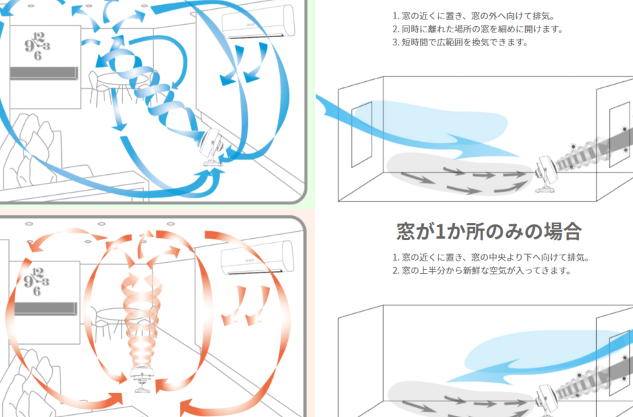 冷房や暖房を使用するとき、サーキュレーターを併用して効率的に空気を循環させます。