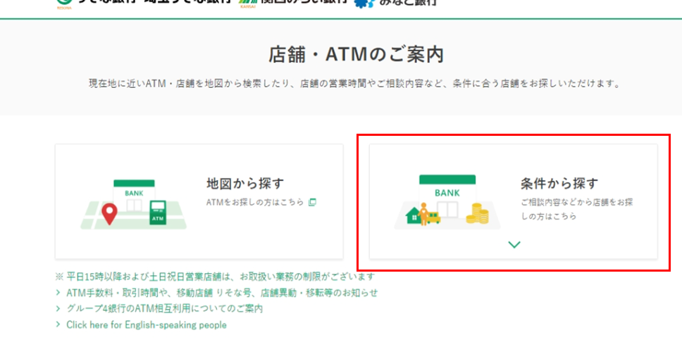 - 支店名または地域を入力し、検索ボタンをクリックする。
