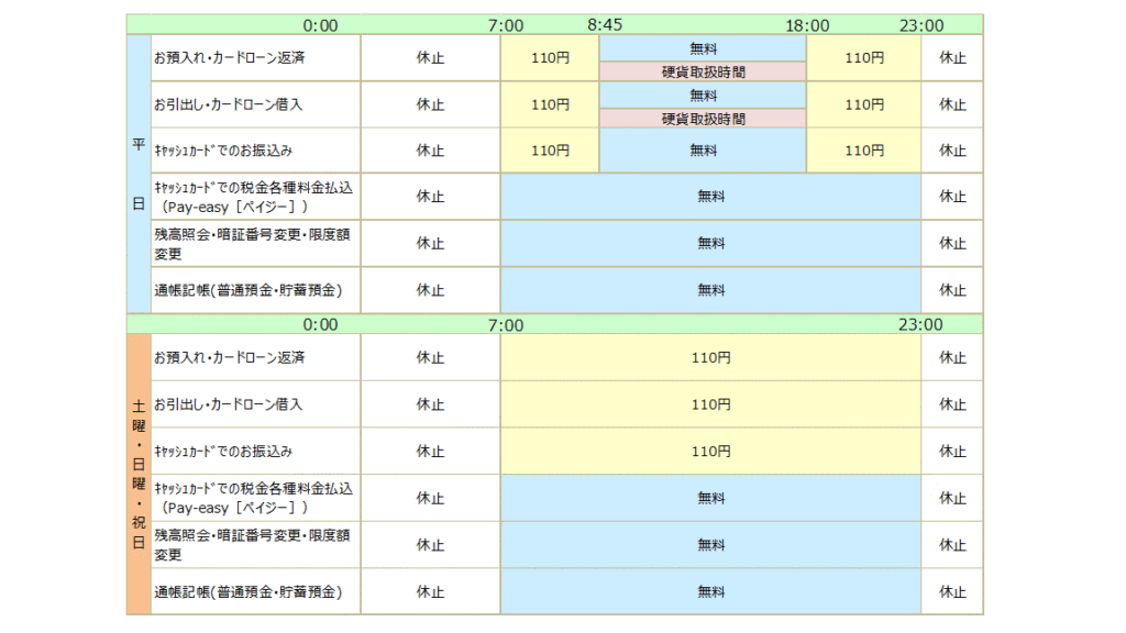 - 残高照会: 残高の確認は無料です。他行カードの場合でも、手数料はかかりません。