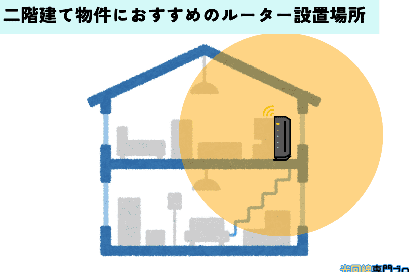 - 階段の近くに設置する。階段は1階と2階の両方に電波を届けやすいポイントとなるため、有効活用します。