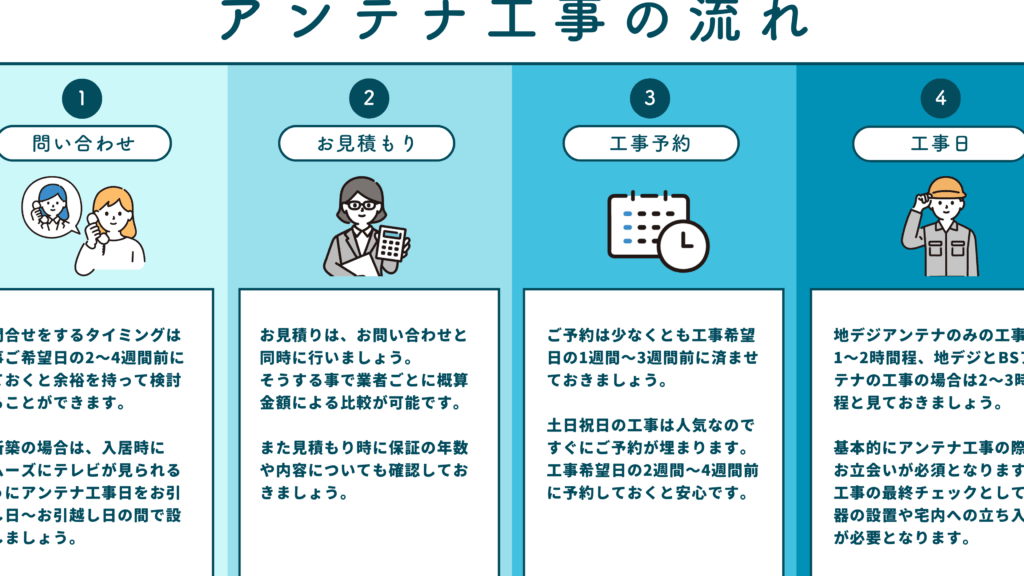 戸建てにテレビアンテナを設置する作業は、次の手順で進めます。