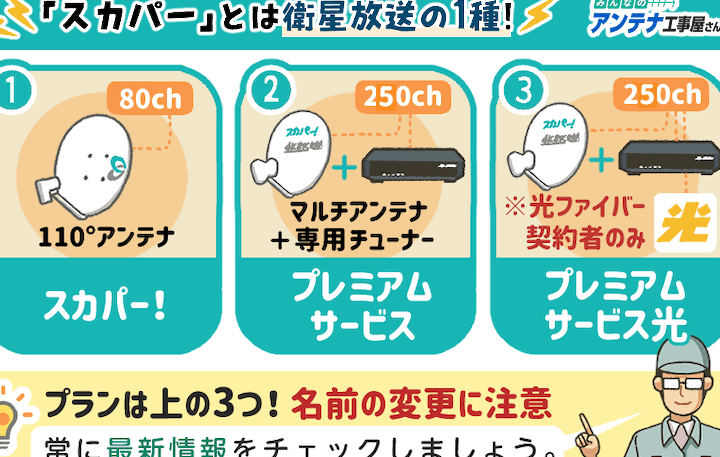 スカパーのアンテナ工事には、主に二つの種類があります。それぞれの特性や設置状況に応じて、最適な選択が求められます。