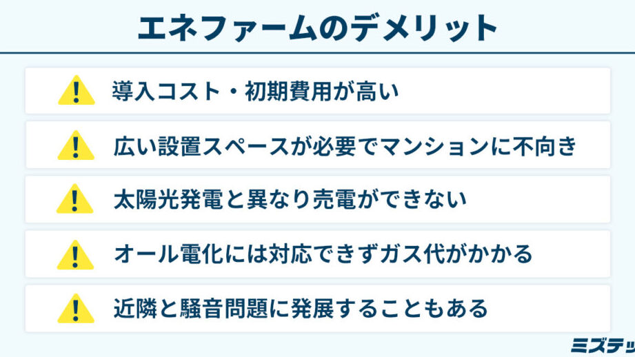 エネファームにはいくつかのデメリットが存在します。そして、これらの問題を理解することで、導入の判断がより明確になります。