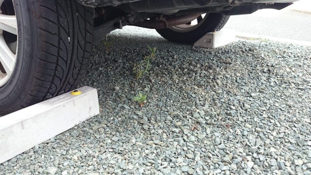 - 完成品を設置する。 駐車スペースに車止めを設置し、位置を調整します。