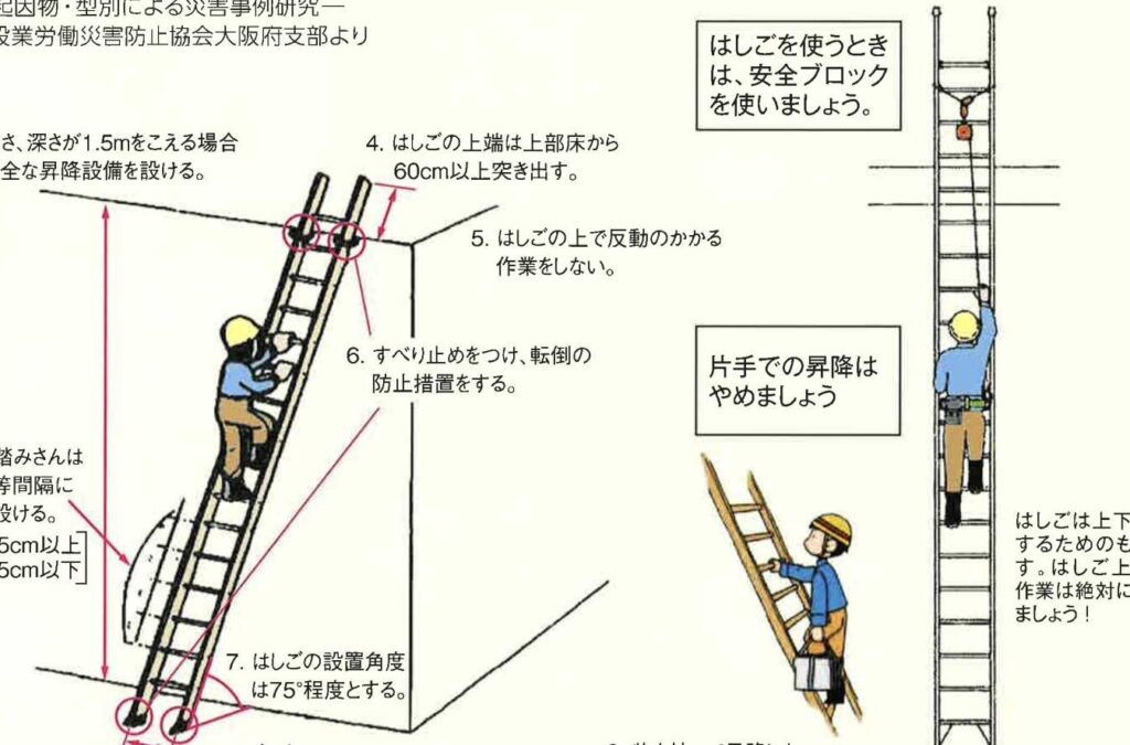 - 梯子の設置状態を見直す。地面が傾いていないか、適切な角度が保たれているか確認します。