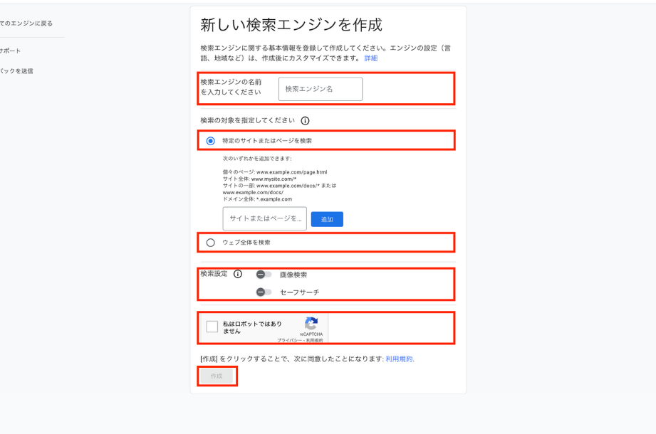 - 検索エンジンの設定ページにアクセスする。 必要な情報を入力します。