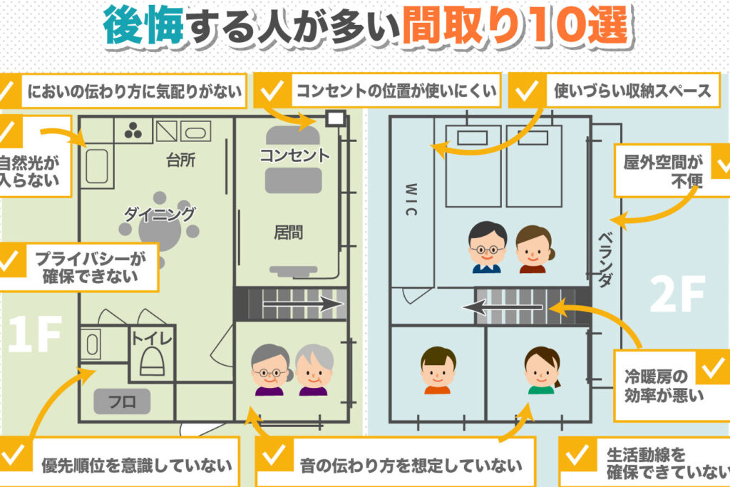 - プライバシーを考慮しない部屋配置:リビングルームと寝室が近すぎ、音が気になる状況が生じることがあります。