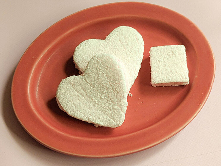 - 切り分ける。 固まったマシュマロを型から外し、好みのサイズに切ります。