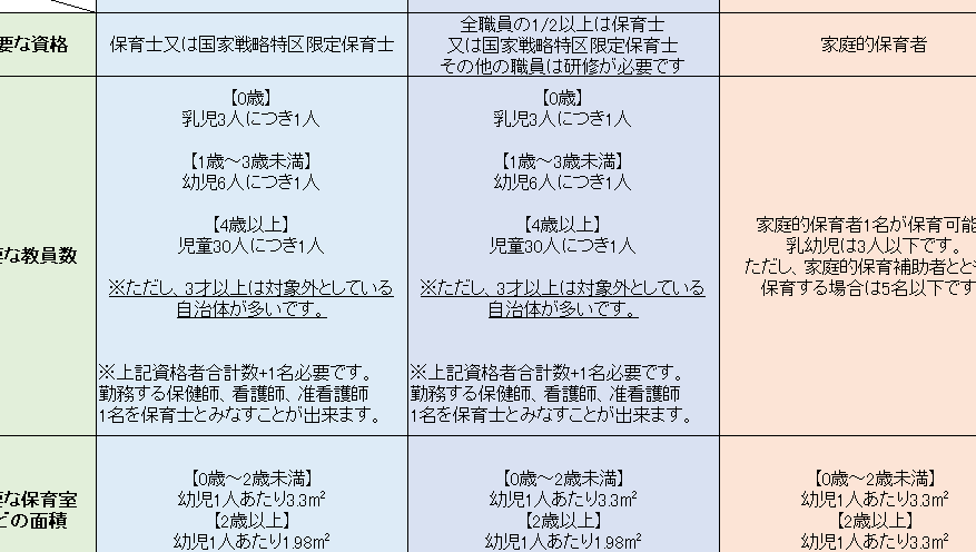 - 面積の基準: 子ども一人当たりの面積が法令で定められています。