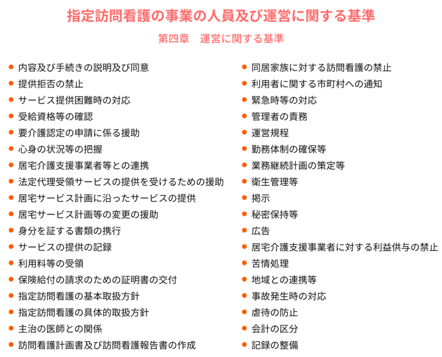 - 看護師の数が十分でなければならない。例えば、利用者数に応じた適切な看護師の配置が必要です。