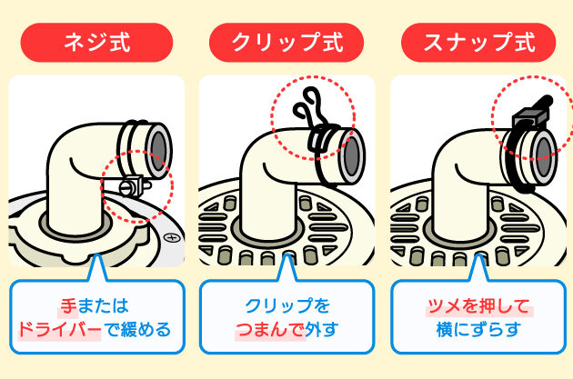 - 古い排水ホースを外す。 固定クランプを外し、ホースを引き抜きます。